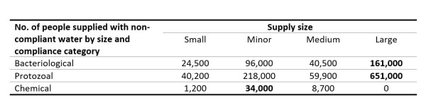 People are being supplied with water that does not comply with the chemical requirements of DWSNZ. This is a reduction of 54,440 from the previous year.A lot of the public facing messaging was around the vulnerabilities of small supplies. Whilst this is a known issue, particulalrly in tourist destinations, the use of percentage compliance figures can be misleading. The following table shows the number of people supplied with non-compliant water from different supply sizes. It can be seen that the majority of people supplied with water non-compliant with the bacteriological and protozoal requirements of the DWSNZ are served by large supplies.