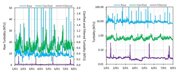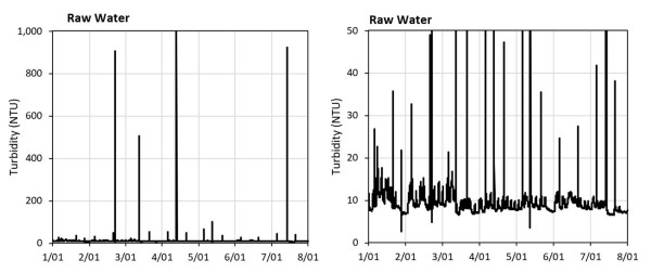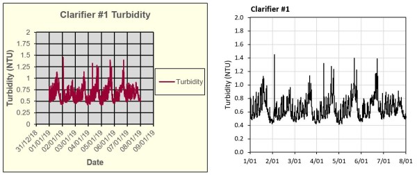 How many times have you seen poorly scaled graphs that obfuscate the data? Here are a few examples of poorly scaled graphs with potential alternatives. In this first example the graph has been set to the instrument scale. The spikes up to 1,000 NTU aren’t adding any value. A simple re-scale shows the data, without losing any important detail.