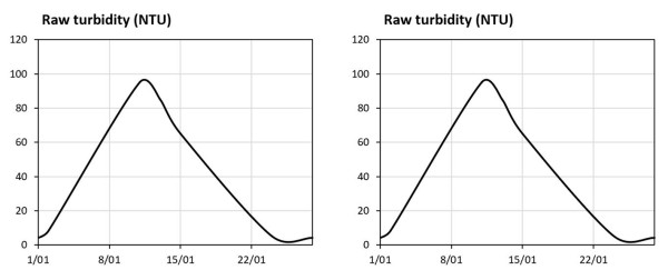 Take a look at this next example of an XY graph showing a raw water turbidity event. The left-hand version is presented as if there was a steady increase in turbidity to a peak at around 95 NTU. In reality the data does not support this conclusion. The data points are shown in the right-hand graph. This shows the event peak may have been 95 NTU or it may have been much higher. There may have been a steady increase in turbidity, or it may have suddenly spiked.