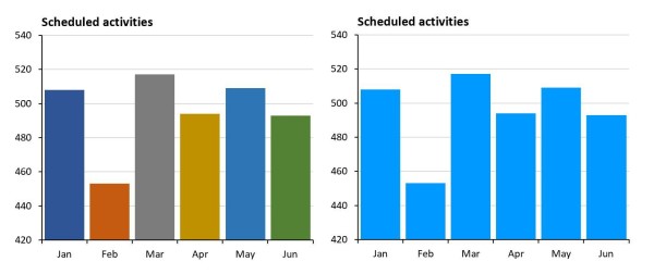 The over-use of colours is demonstrated further in this next example. In this bar graph the different colours add no value and actually make it harder to interpret the graph, since the colours infer meaning. Whereas a single colour helps the reader compare the differences. Black can be a little oppressive for this style of graph so use a lighter colour.